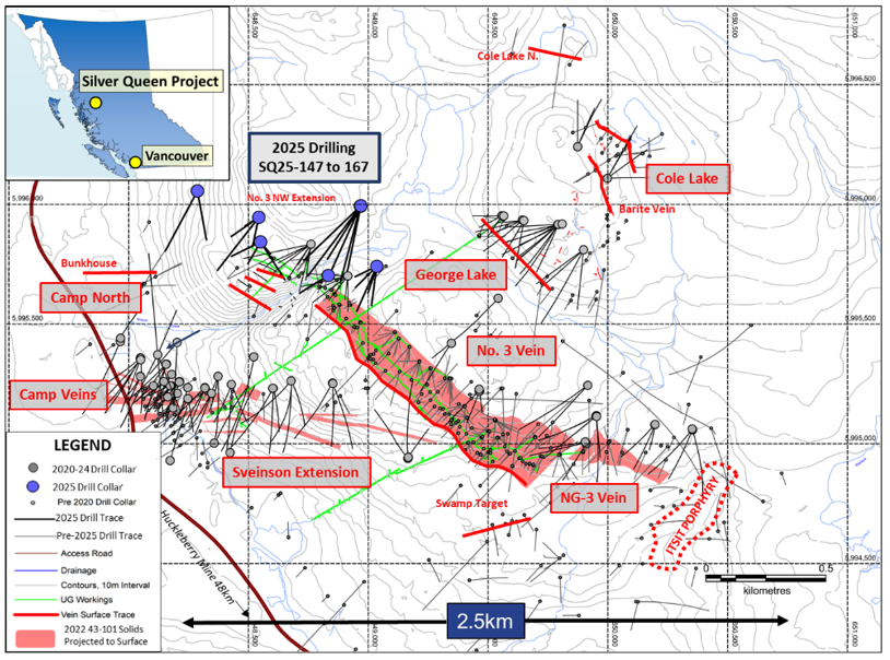 VP Exploration Rob Macdonald commented, “The Summer ’25 drill program successfully extended mineralization in the No. 3 and No. 2 vein sets for up to 650 metres laterally and to depths of 450 metres below surface. Mineralization identified in the current drill program continues to expand and develop continuity within the vein sets and is accretive to previously modelled mineral resources on the Silver Queen Project. Work in 2025 will continue to incorporate the new drill data into a revised exploration and resource model, in anticipation of a Mineral Resource update to be prepared in Q1 ‘26, and to continue exploration on the ever-expanding Silver Queen vein system in 2026.”