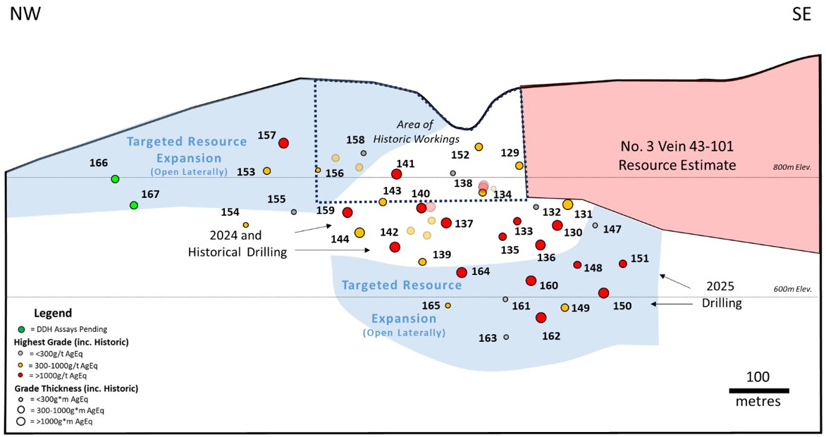 Drilling continues to extend mineralization along strike and to depth along the northwest extension of the No. 3 vein and has now tested down-dip of previously released high-grade intercepts from 2024 drilling (eg: SQ24-136: 7.6m est TT. averaging 431g/t AgEq; see NR-15-24, December 17, 2024) and along strike of intercepts from earlier in 2025 (eg: SQ25-148: 3.5m averaging 536g/t AgEq; see NR-07-25, August 11, 2025). Mineralization now extends to depths of 450 metres below surface. Multiple veins have been intersected in most of these holes, including veins that have historically been identified as the No. 3 and No. 2 veins. Several additional hangingwall and footwall intercepts have been identified and drilling continues to provide definition to each of the vein sets and mineralized segments.