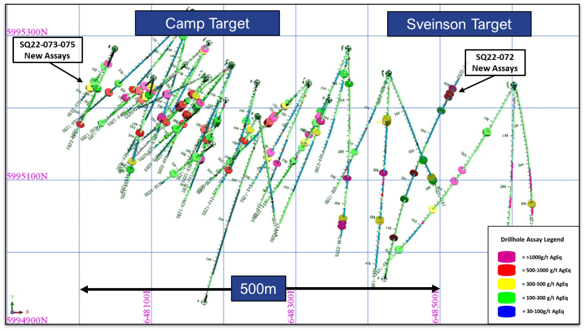 - a 0.6 metre interval grading 2.1g/t Au, 1,705g/t Ag, 4.3% Cu, 1.6% Pb and 4.1% Zn (32.9g/t AuEq or 2,470g/t AgEq) within a 1.2 metre interval averaging 1.0g/t Au, 802g/t Ag, 2.1% Cu, 0.8% Pb and 2.0% Zn (15.8g/t AuEq or 1,183g/t AgEq) from drillhole SQ22-072;